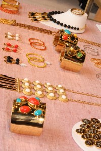 TT: I think you can never directly knock something off, whether it’s a piece of clothing or a bag, it has to always be updated and reinterpreted to make it modern. In terms of the jewelry line for example, a lot of the vintage pieces I had had hints of color. We definitely incorporated the idea of strong color into the jewelry. We used resin for the colored material. These stones on this are resin. Color was important and the boldness of some of the vintage jewelry was something we incorporated. I don’t wear dainty jewelry. I’m into big and bold.