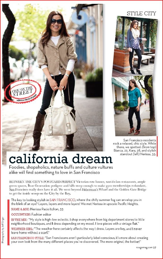 The piece was a travel meets style profile for a Toronto-based magazine, Rouge, an editorial- advertising hybrid for P&G beauty. I was a bit flustered when the editor interrupted, since I was mid-latte with a journalist friend of mine, who I hadn’t seen in ages. But with the two of us knowing the challenges of asking random strangers on the street for interviews, my friend gave me the thumbs up to help out the weary magazine crew, and away I went to the impromptu shoot on Fillmore Street.