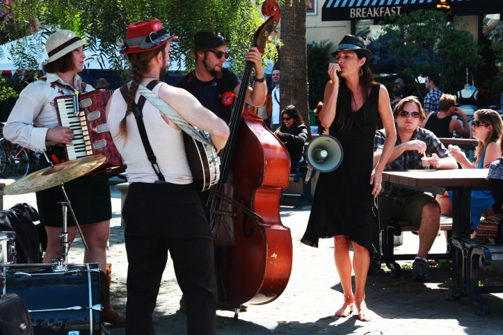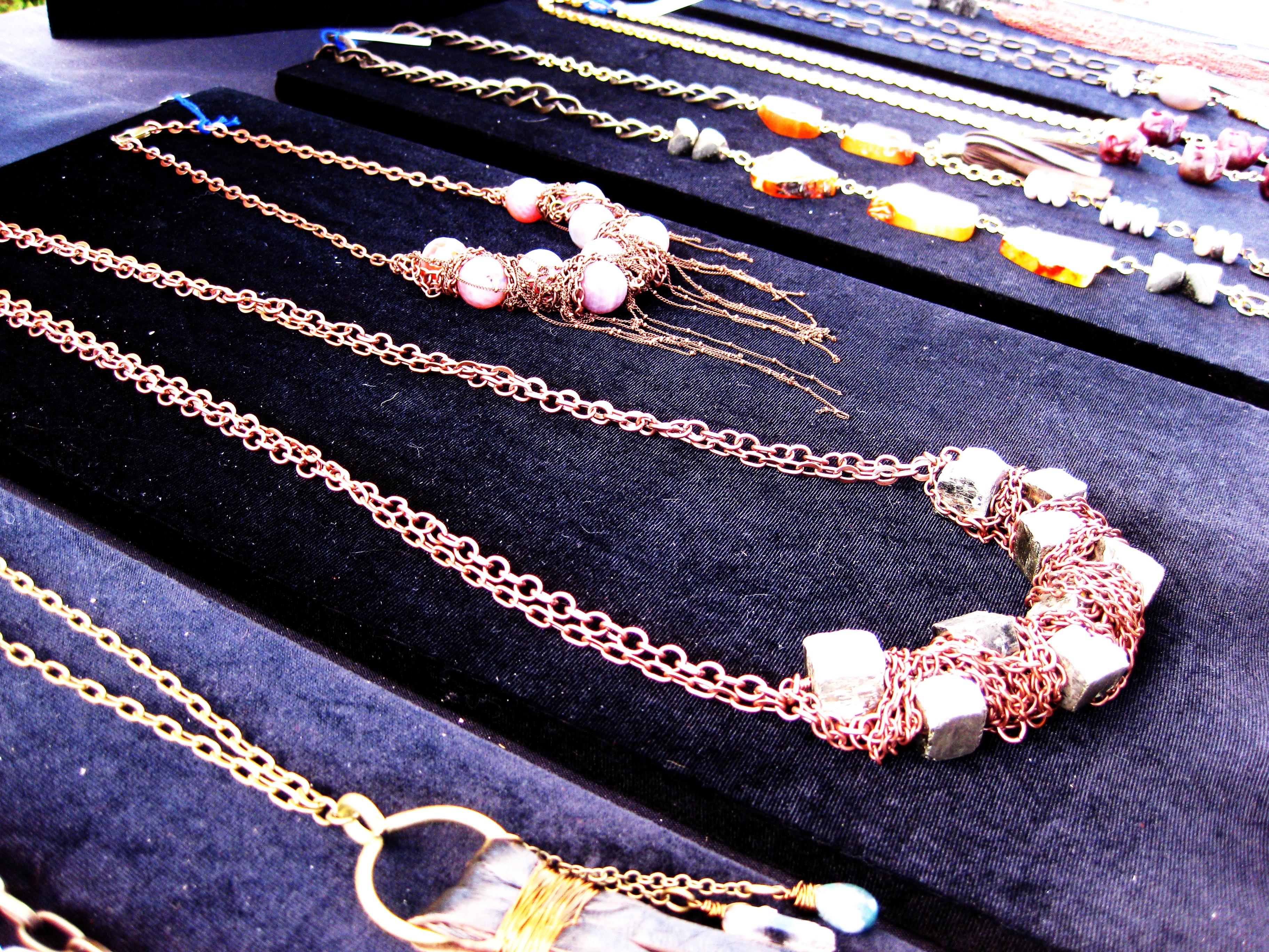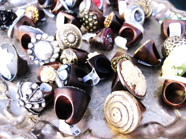 Stretch applique headbands by local designer Doe Eyed and Pigeon ToedSteampunk style: leather combat boots, tats, and a lace-trimmed parasol.Gorgeous, one-of-a-kind statement rings made from carved Indonesian wood and found objects by J. Fein DesignsFine handmade jewelry, not for the faint of heart, by Mina Caragay of Dear MinaMatching couple capris!Recycled vintage jewelry by The Weekend StoreIn love with this vintage harmonica necklace by The Weekend Store. Adore!