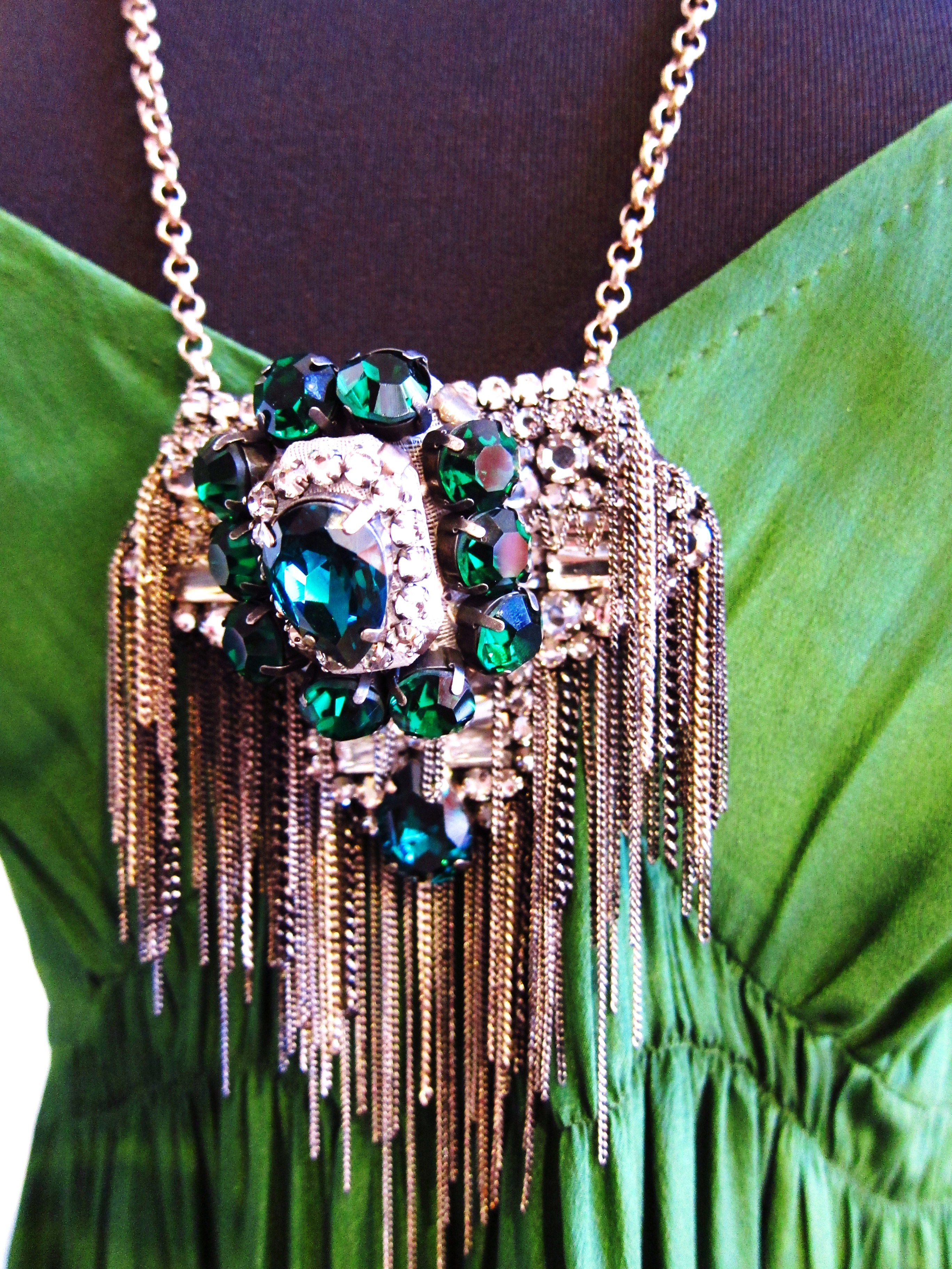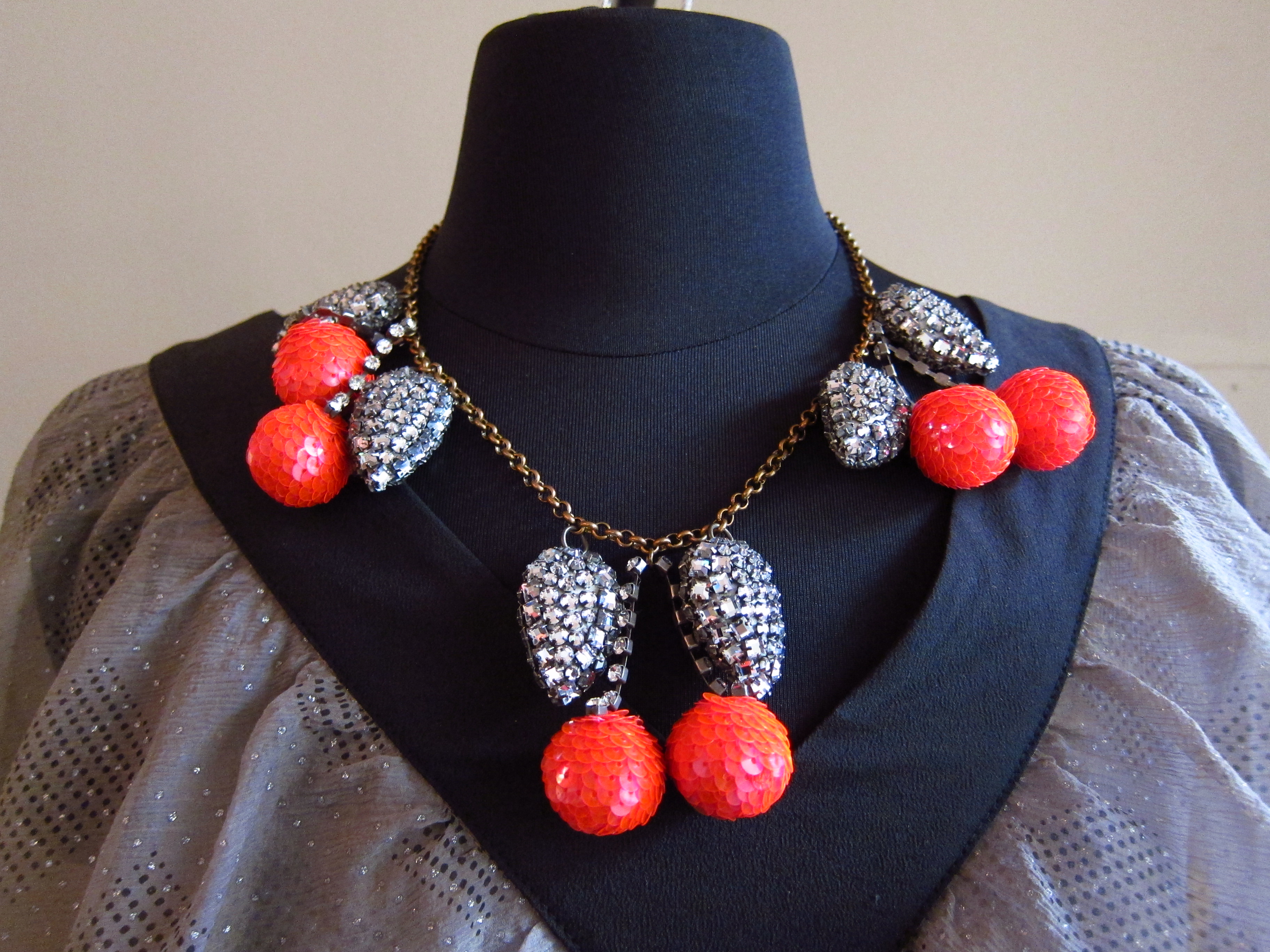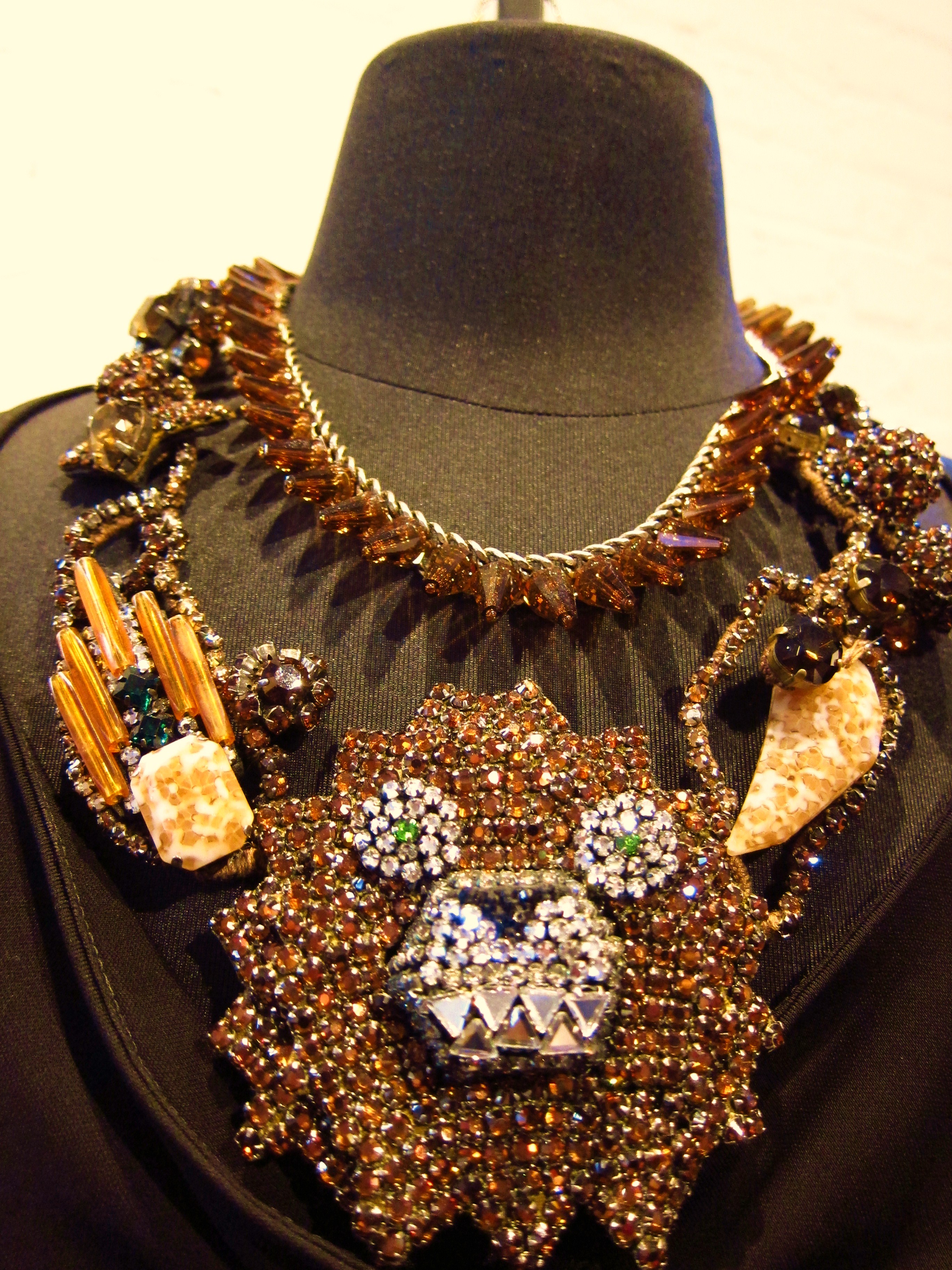 The jewelry could be described as the antithesis of minimalism. Glittery silver sequins meshes with chunky Swarovski crystals, braided and twisted chains, and unexpected household materials like neon rope or rubber electrical wire casings. One look at her collection and it all makes sense that Rhaiem is an alum of textile research and design at the houses of Galliano, Cavalli and Chloe— and that her pieces have been snatched up by the fashionably fearless Lady Gaga and Sarah Jessica Parker.