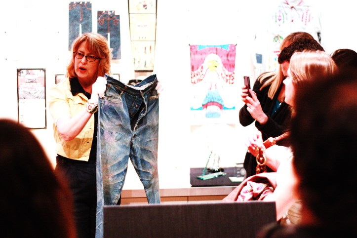 Company historian Lynn Downey, decked out in protective white gloves, showed off pieces from Levi’s famed denim vault archive, which included the oldest pair of 501 blue jeans worth a whopping $150K, sewn in 1879. (Levi’s paid just $40,000, she said, for a six-piece collection).