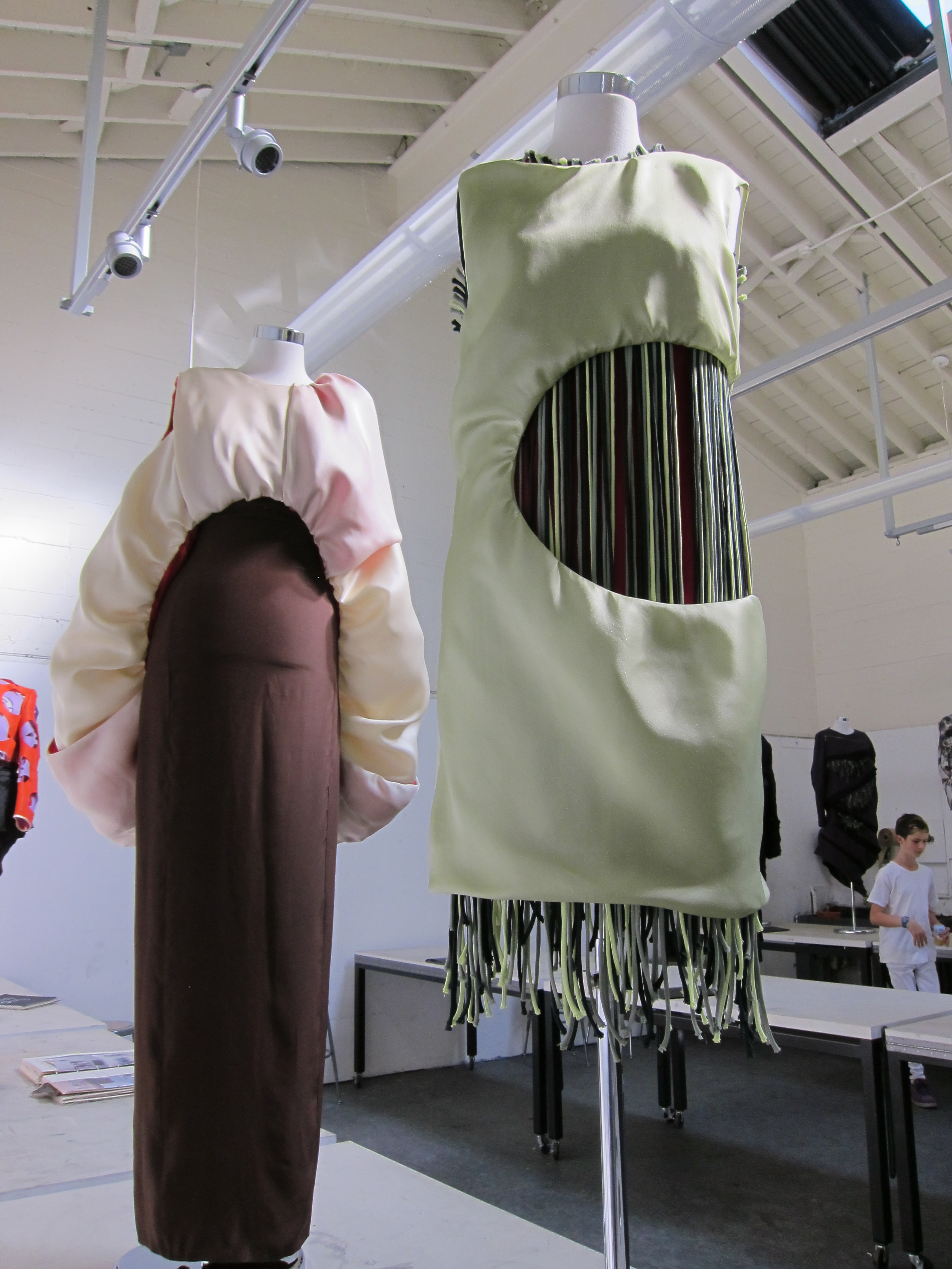 The set up reminded me a lot of the Hyeres International Fashion and Photography Festival in the South of France, where each emerging designer had on display their portfolios, including mini “mood boards” and original sketches, alongside the final pieces. Seeing the story of the work is often as intriguing for me as seeing the work itself. It gives me the chance to get inside a designer’s head for that brief moment and make the connection between the original inspirations and the final outcomes. The clothes ranged from beautiful and commercially sellable to odd wearable art—and everything in between.
