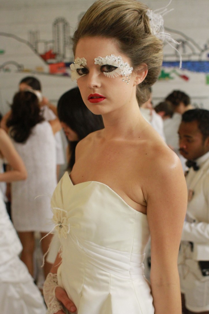 “This collection was inspired by snow before I even knew I was going to participate in Snow,” said Vieux backstage while working on last-minute fittings on her models.