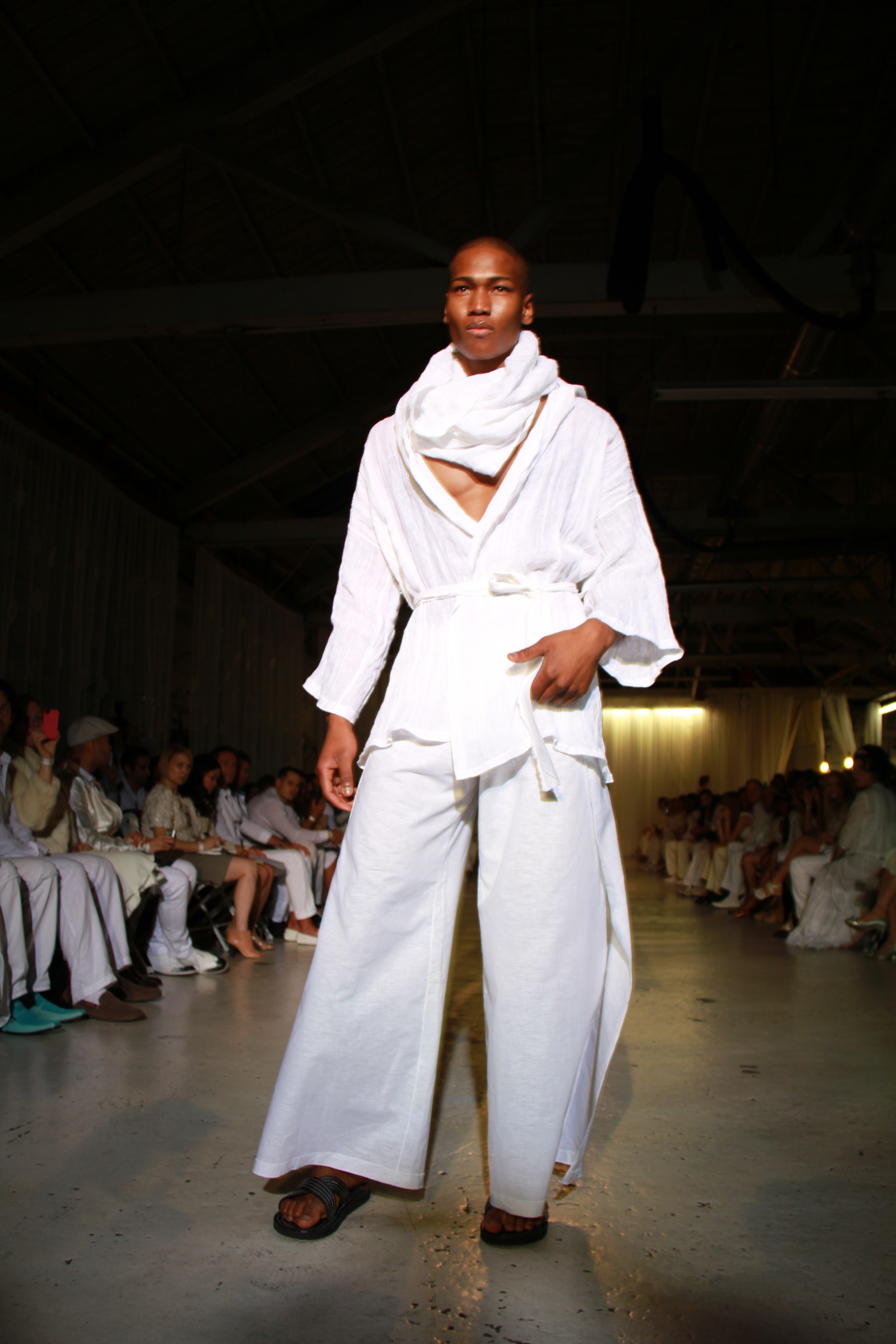 Klebanoff, a student at City College of San Francisco who has worked as an intern for Domingo, kept things fresh with his G.I. Joe-meets-1970s-inspired menswear collection. Basic jersey T-shirts and turtlenecks paired well with trim, structured suits in white cotton twill and linen.